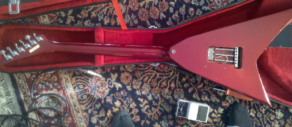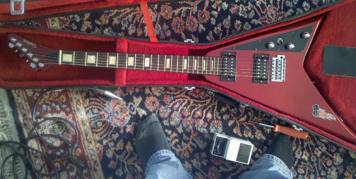 An Epiphone electric owned by a friend.  It looks like it's built pretty well but the bridge is installed in a location that makes it nearly impossible to intonate.  The closest thing I can find on the web is the "Demon" though that has different controls and bridge.  This thing appears to have a  stock Stratocaster-type bridge.  It's set neck, or perhaps neck-through.  I don't know the age.  I'd have to guess '80s or maybe early '90s.